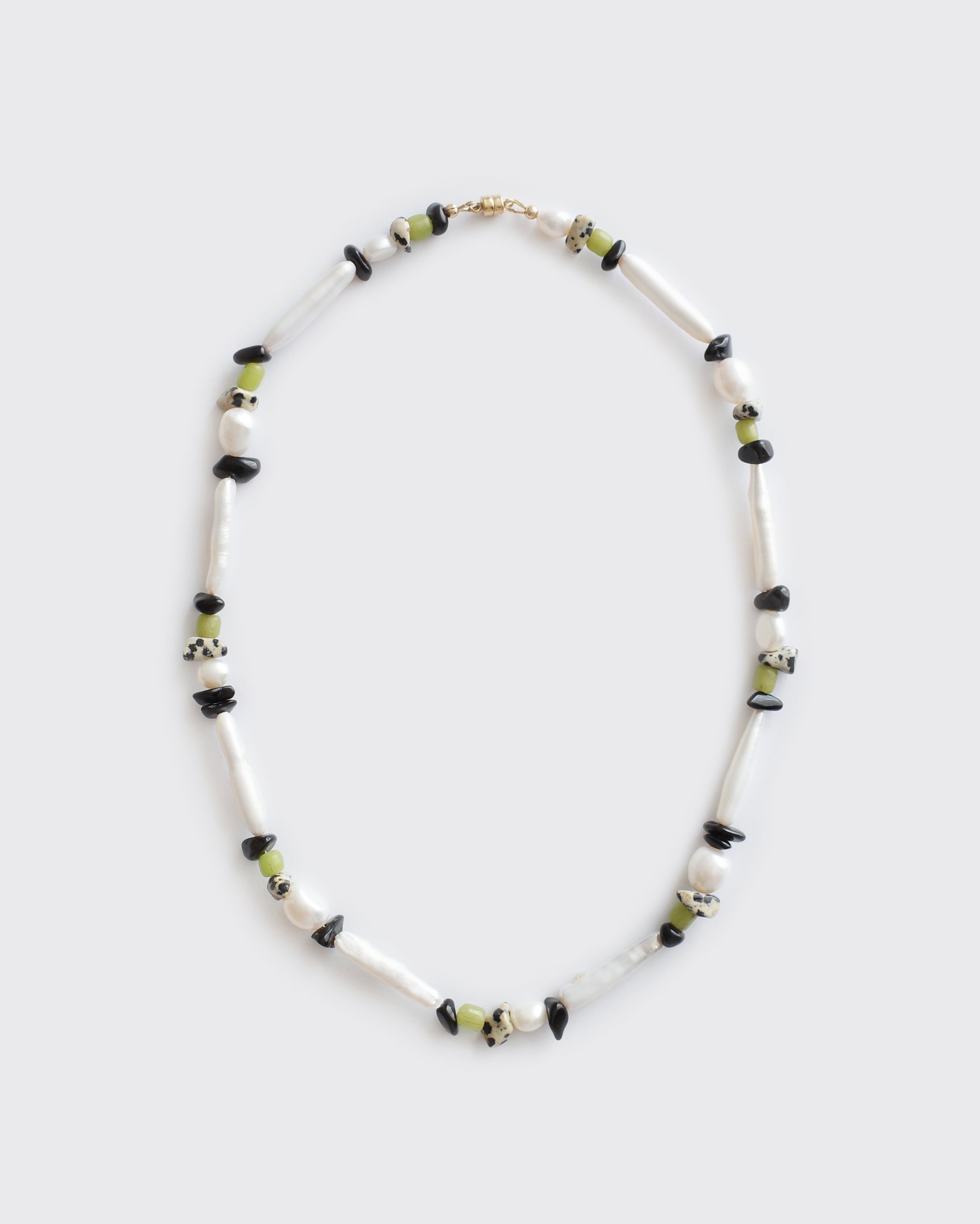素材:淡水パール、ダルメシアンジャスパー、オブシディアン、ガラスビーズ、14金ゴールドフィルド
