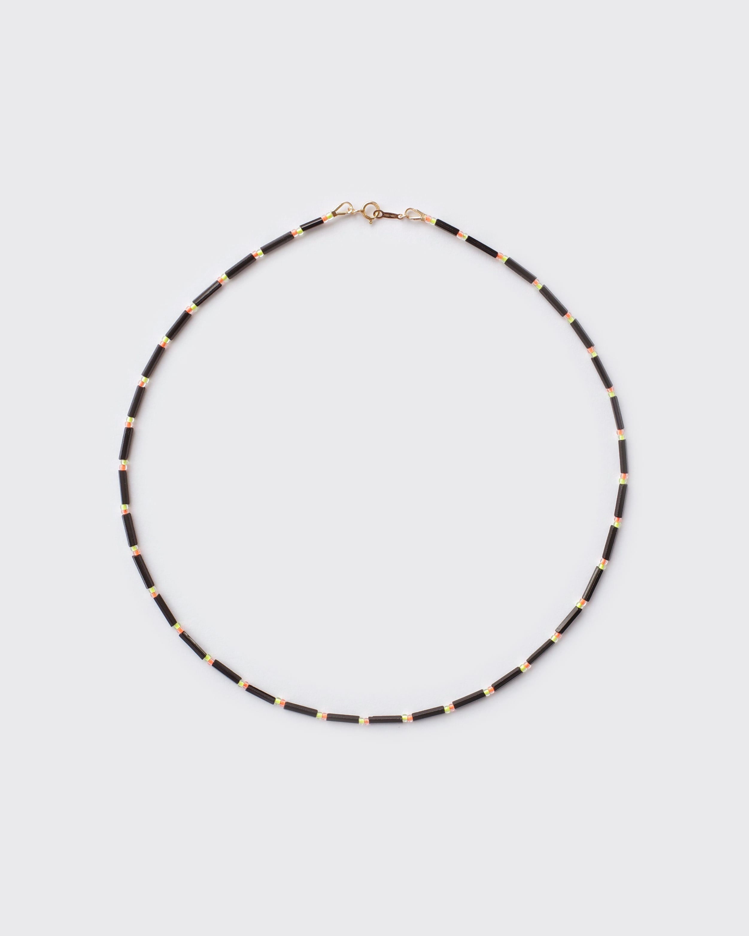多面体のブラックビーズは、角度によって光を跳ね返し、シンプルなデザインの中に奥行きを与えてくれます。