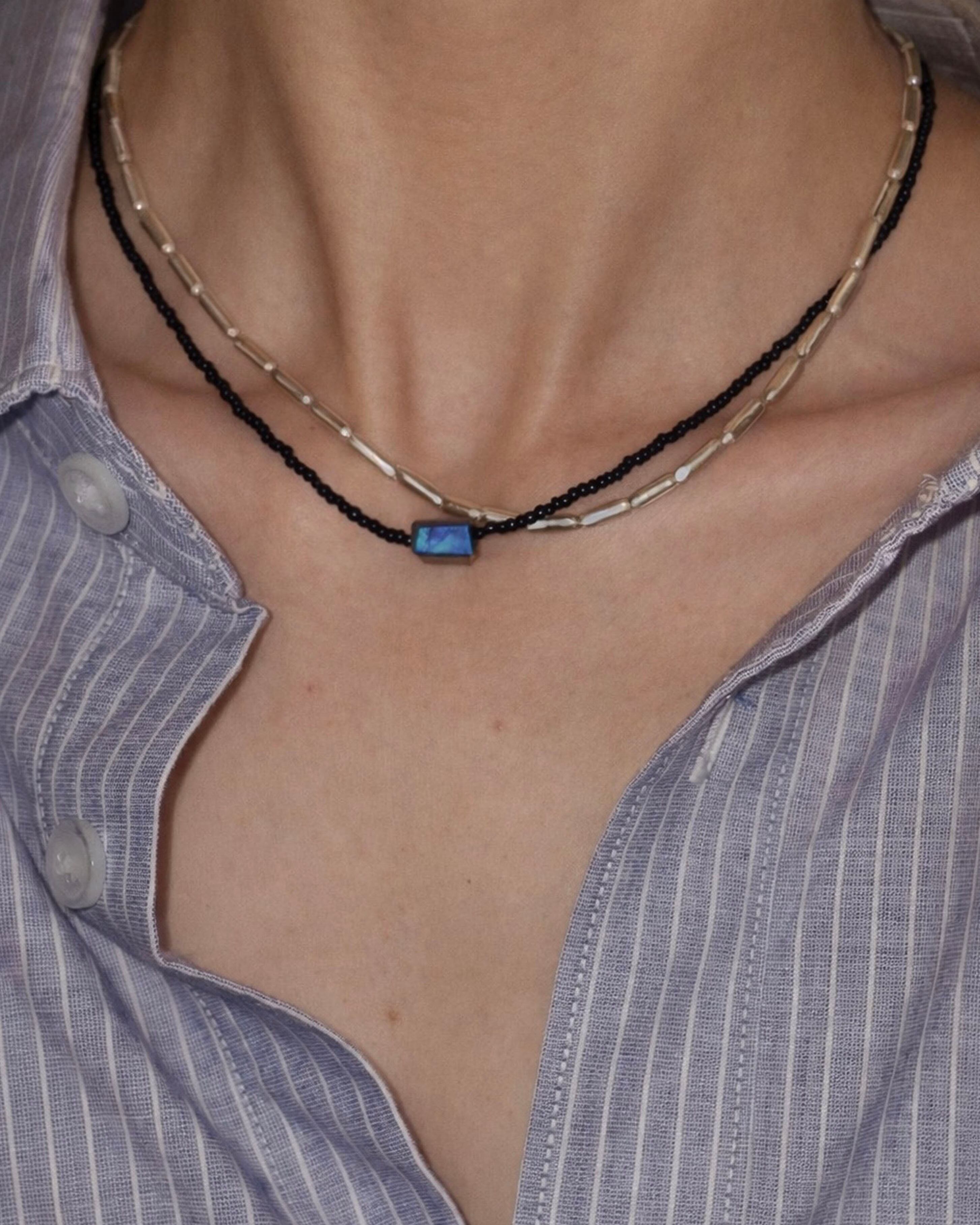 丸みを帯びたチューブ型ビーズは肌になじみやすく、あらゆる装いに自然と調和します。