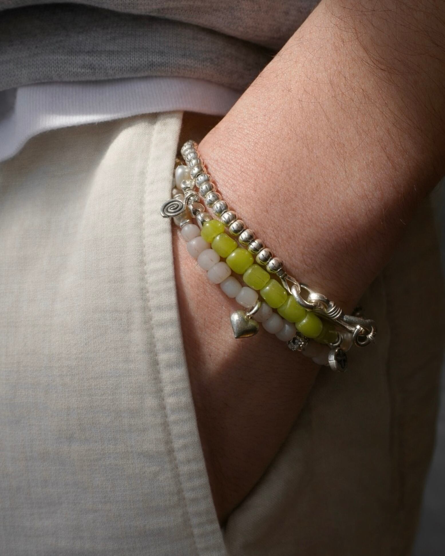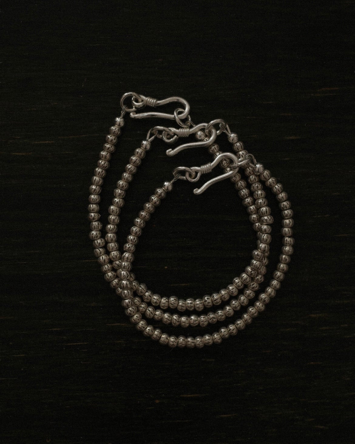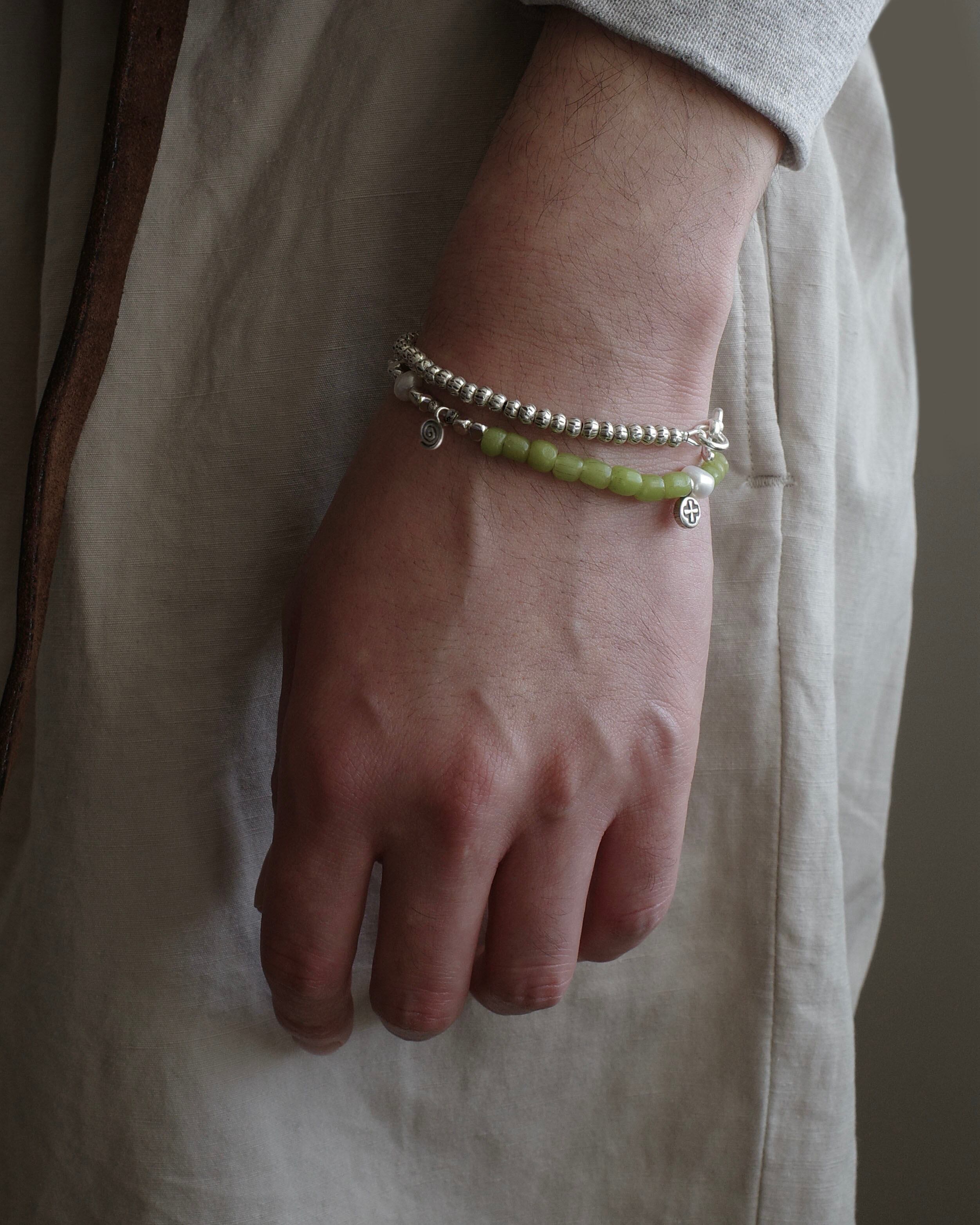 職人の手によってひとつひとつ丁寧に作られたカレンシルバーのビーズを連ねた、ミニマルで洗練されたデザインのブレスレット。タイの山岳民族・カレン族の伝統技術によって生まれたビーズは、それぞれにわずかな表情の違いがあり、無二の魅力を放ちます。