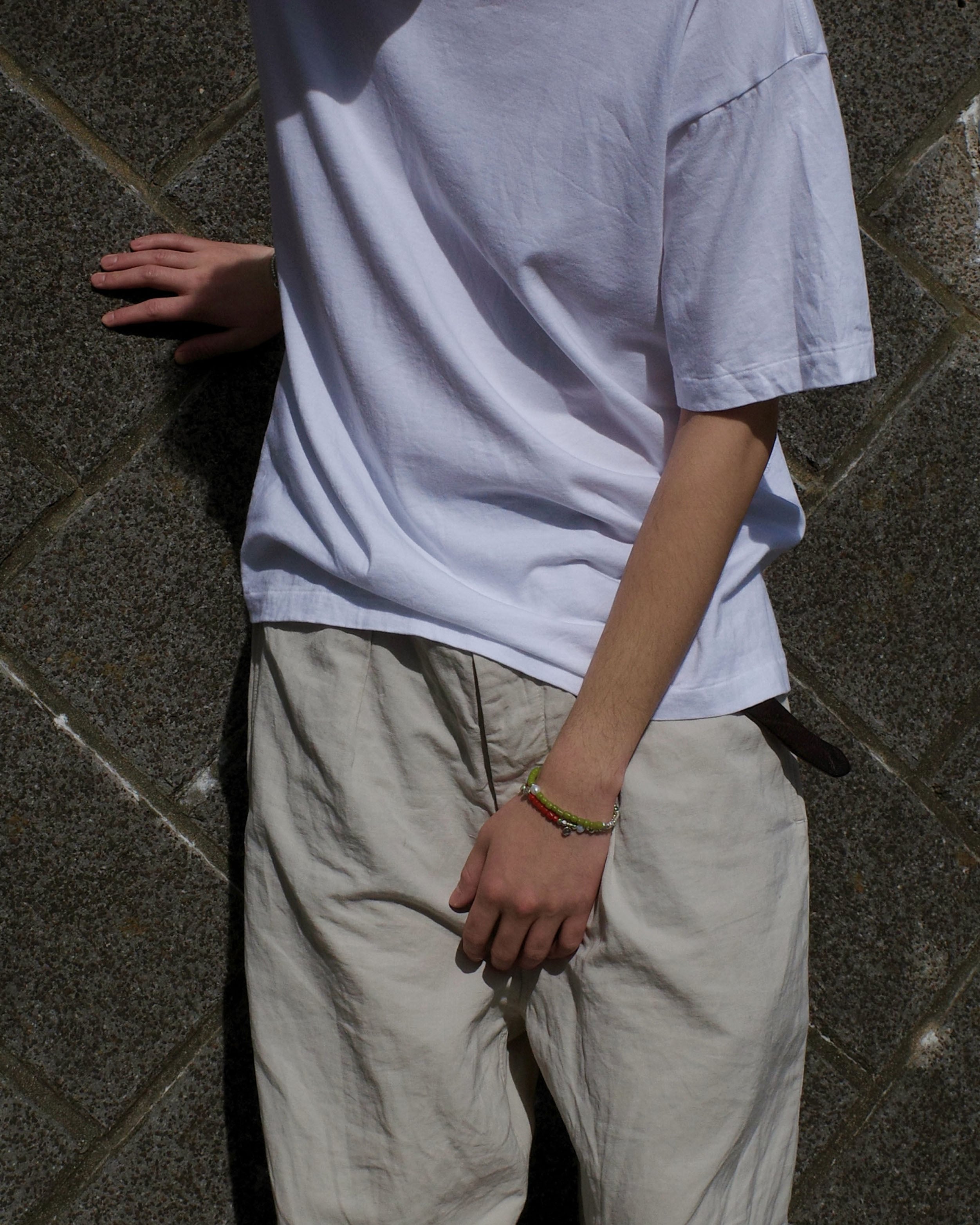 絶妙な色味を持つガラスビーズと、落ち着いた光を持つカレンシルバーによる異なる質感を組み合わせたデザイン。それぞれのパーツは、手元の動きに応じて異なる表情が現れるよう、パーツの配置が細かく計算された一本です。
